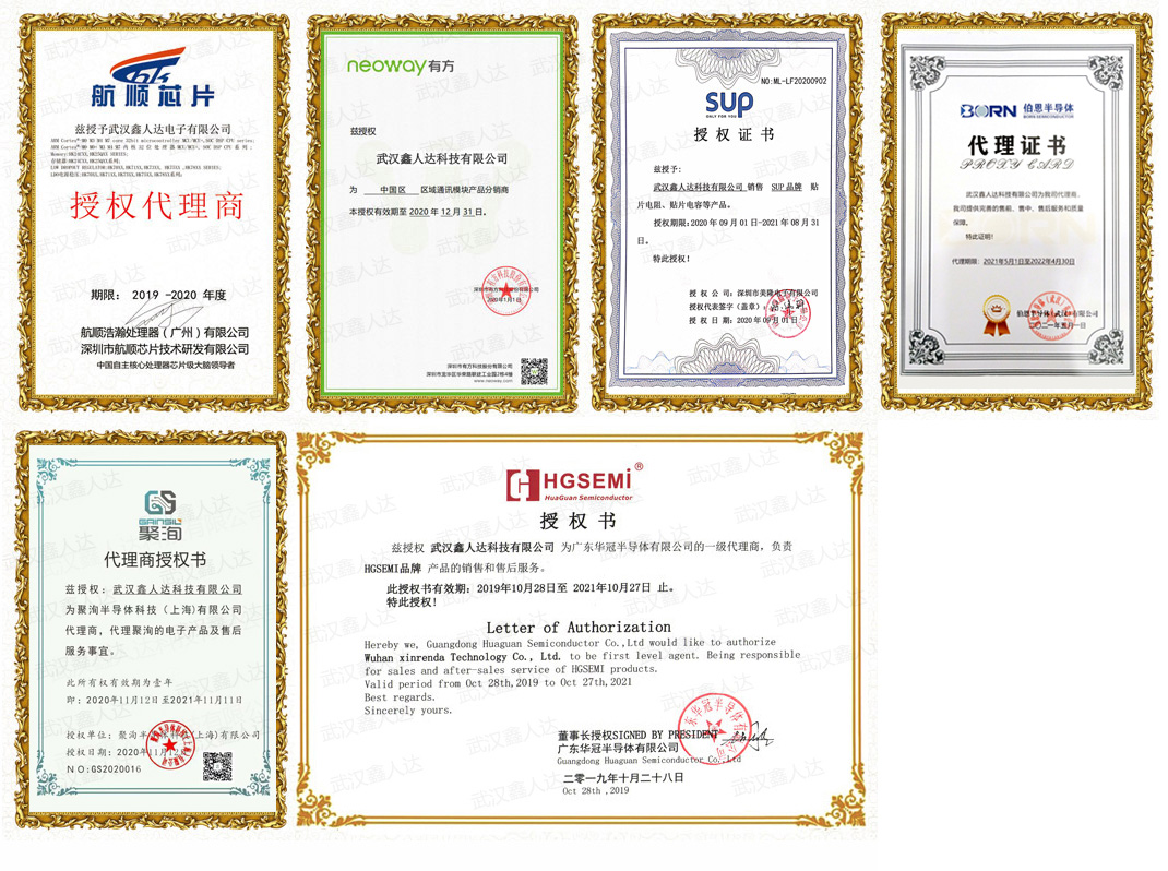 公司已获得正式授权代理的厂商有:有方科技、航顺芯片、聚洵半导体、华冠半导体、风华高科、美隆电子等。由于经营项目的、经营物料的多样性,极大的方便了新老客户的选择。另外公司已通过ISO9001质量管理体系认证。 代理证书 公司新闻 2023年春节放假通知岁末将至,敬颂冬绥元春始风华,万象启新朝山河无恙 盛世中华——热烈庆祝新中国成立72周年百年大党 风华正茂--致敬中国共产党成立100周年节日快乐——致公司女性职工的一封信 <<返回上一页>>