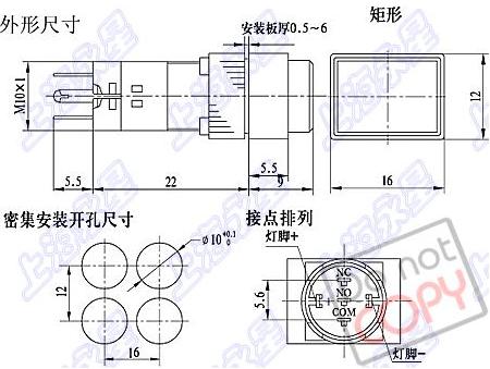 按钮开关是由按钮、传动机构和动、定触点组成。它是通过按钮推动传动机构,使动触点与定触点接通或断开来完成电路换接的。它的工作方式大致有以下三种:1)按下工作,松开复位;2)按下自锁工作,再按脱锁复位的;3)按下一次,换接一次的等。 电气额定值(阻性负载):3A 250V/AC 接触电阻(初始值):小于等于50毫欧