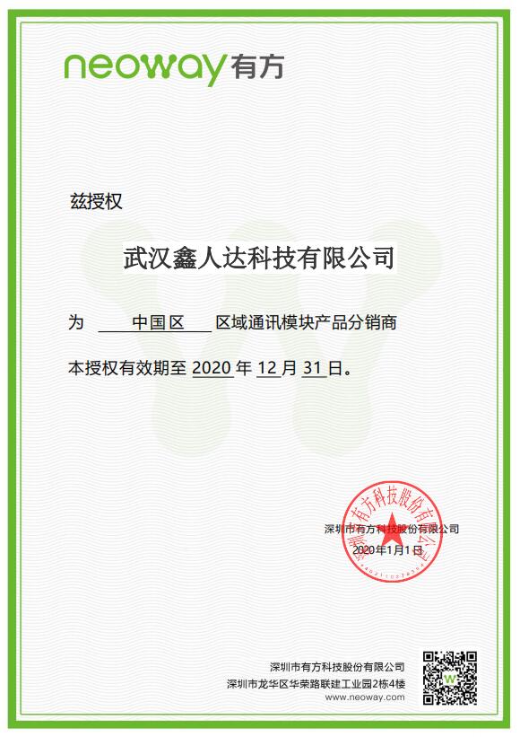 鑫人达喜获深圳有方2020大中华地区一级代理资质,至此鑫人达已经连续两年获得有方模块一级代理资质。