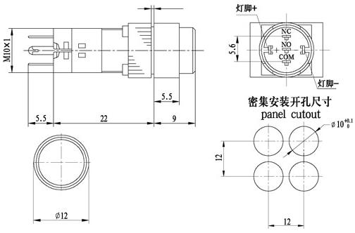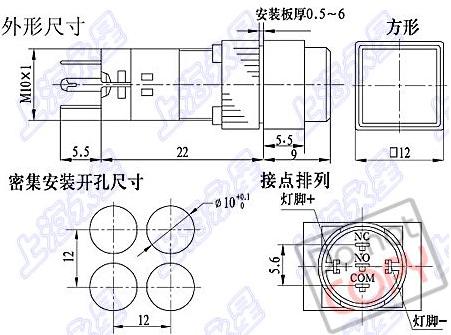 按钮开关是由按钮、传动机构和动、定触点组成。它是通过按钮推动传动机构,使动触点与定触点接通或断开来完成电路换接的。它的工作方式大致有以下三种:1)按下工作,松开复位;2)按下自锁工作,再按脱锁复位的;3)按下一次,换接一次的等。 电气额定值(阻性负载):3A 250V/AC 接触电阻(初始值):小于等于50毫欧